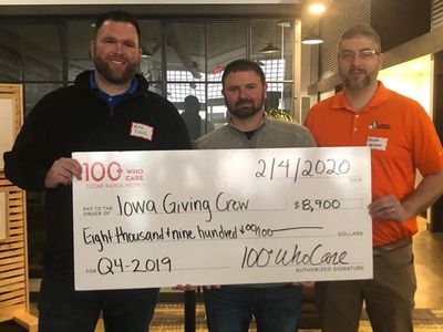 Iowa Giving Crew received a donation from 100+ Who Care - Cedar Rapids Metro for a total of $8,900 in February 2020. The group identified IGC as their selected cause for the fourth quarter of 2019.